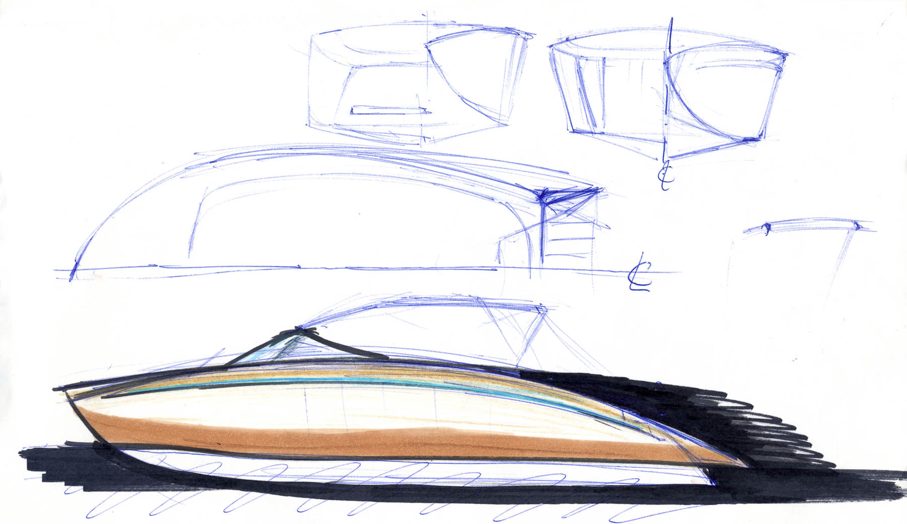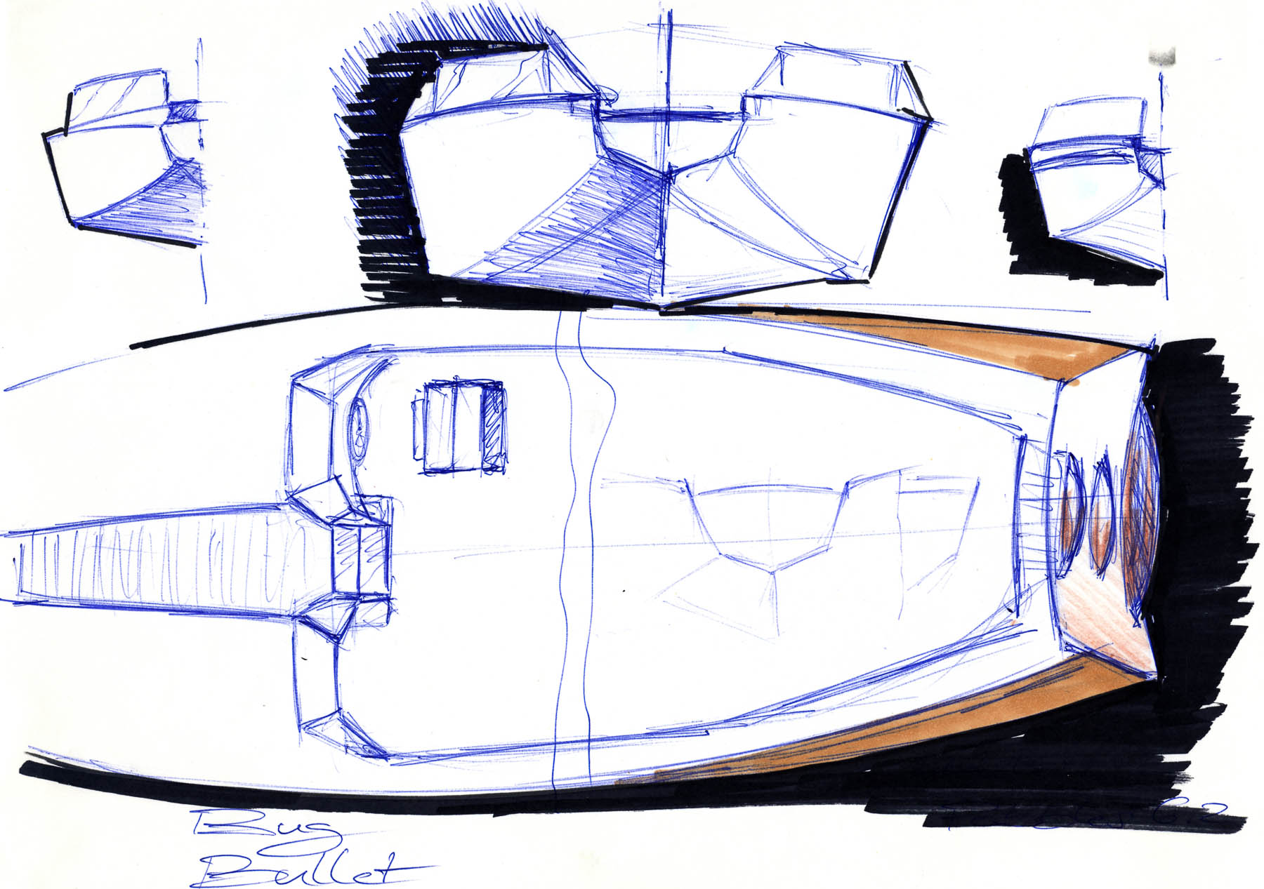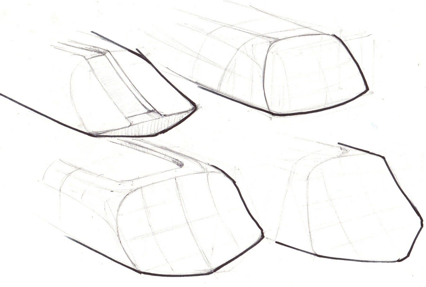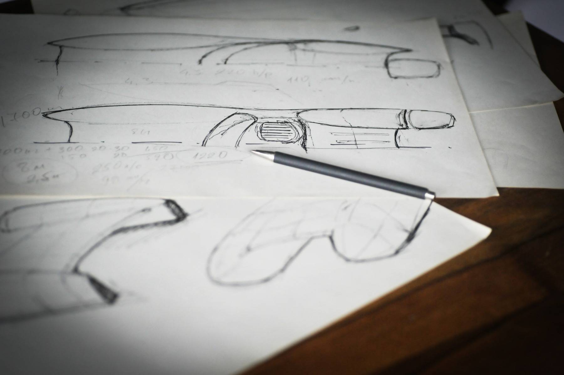 Basierend auf den Erkenntnissen des Briefings wird eine Vielzahl von Handskizzen erstellt. Diese dienen als eine formale Diskussionsgrundlage für das spätere Exterieurdesign.